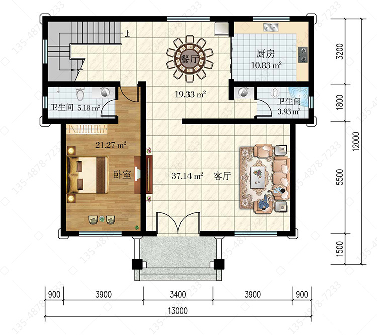 一 层:客厅、卧室(附卫生间)、厨房、餐厅、卫生间