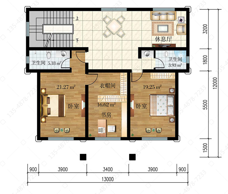 三 层:休息厅、多功能室(附露台)、卧室(附卫生间、露台)、卧室(附露台)、书房、卫生间