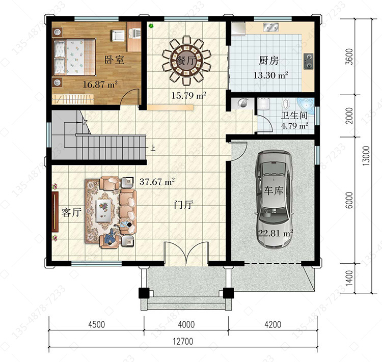 一 层:门厅、客厅、卧室、厨房、餐厅、卫生间、车库