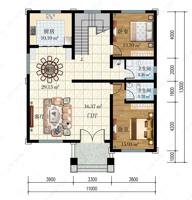 一 层:门厅、客厅(中空)、卧室(附卫生间)、卧室、厨房、餐厅、卫生间