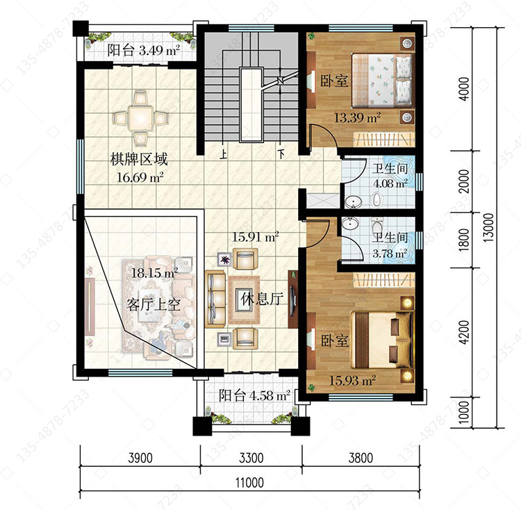 二 层:休息厅、棋牌区域、卧室(附卫生间)、卧室、卫生间、阳台