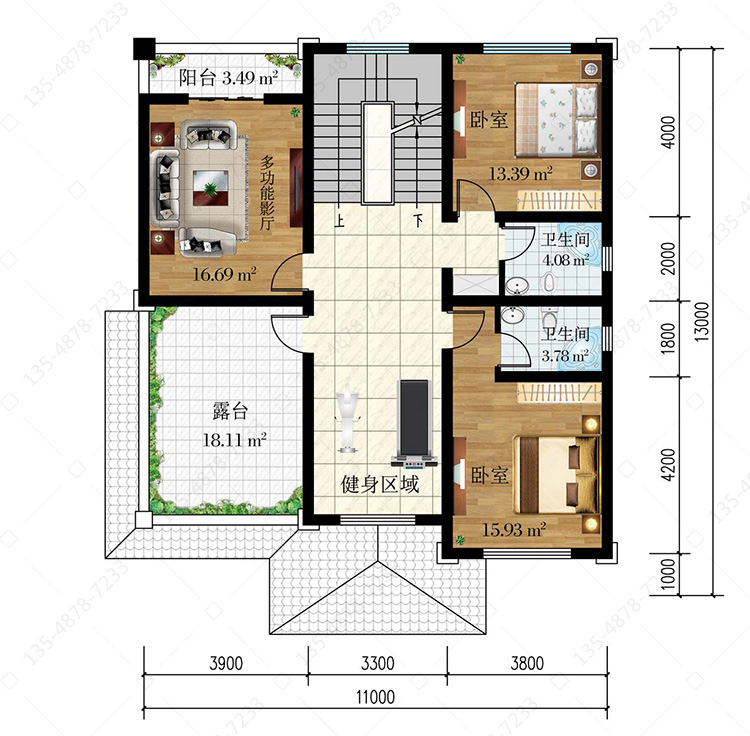 三 层:健身区域、多功能影厅(附阳台)、卧室(附卫生间)、卧室、卫生间、露台