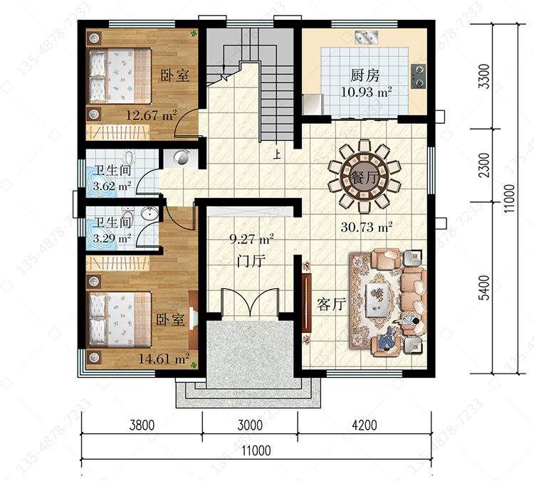 一 层:门厅、客厅、2卧室、厨房、餐厅、卫生间