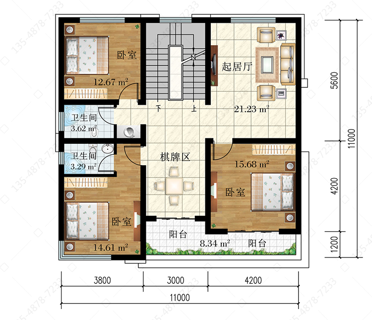 二 层:起居厅、棋牌区、卧室(附阳台)、2卧室、卫生间、阳台