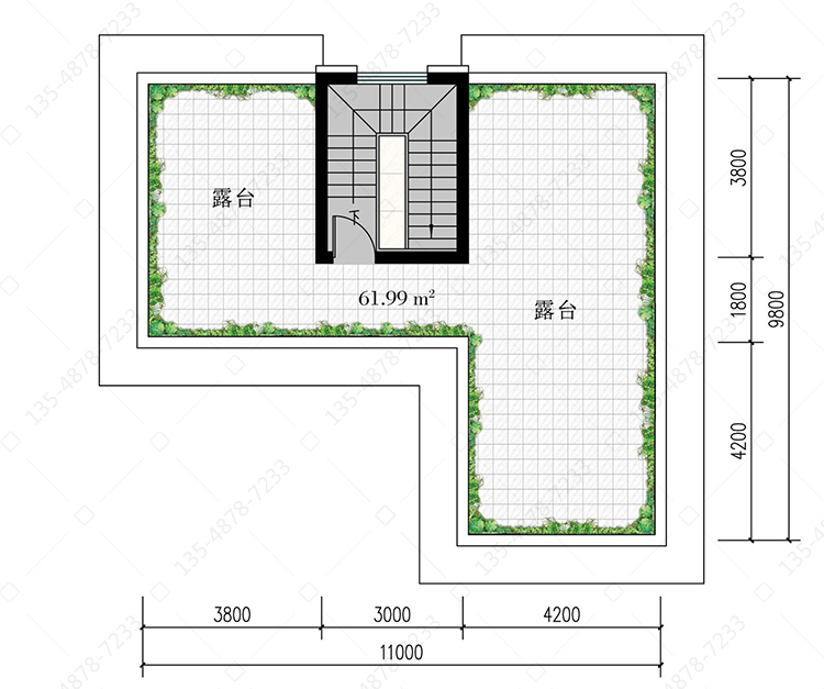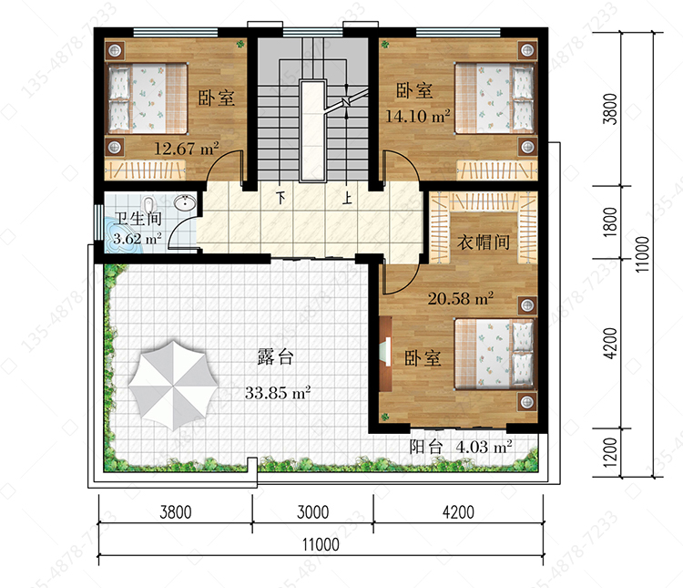 三 层:卧室(附衣帽间、阳台)、2卧室、卫生间、露台