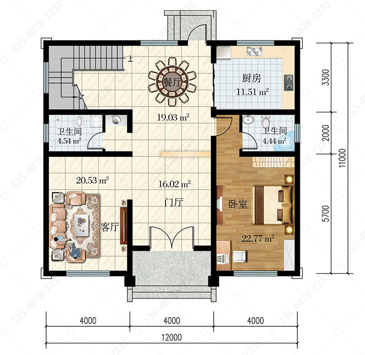 一 层:门厅、客厅、卧室(附卫生间)、厨房、餐厅、卫生间