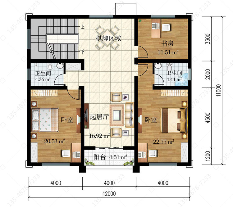 二 层:起居厅、棋牌区域、卧室(附卫生间)、卧室、书房、卫生间、阳台