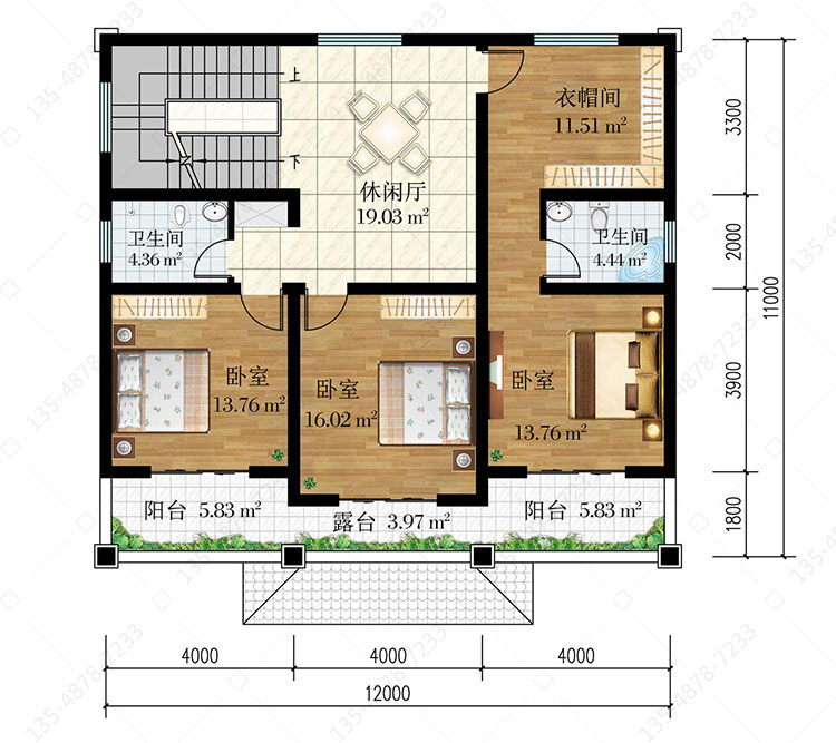 三 层:休闲厅、卧室(附卫生间、衣帽间、阳台)、卧室(附阳台)、卧室(附露台)、卫生间
