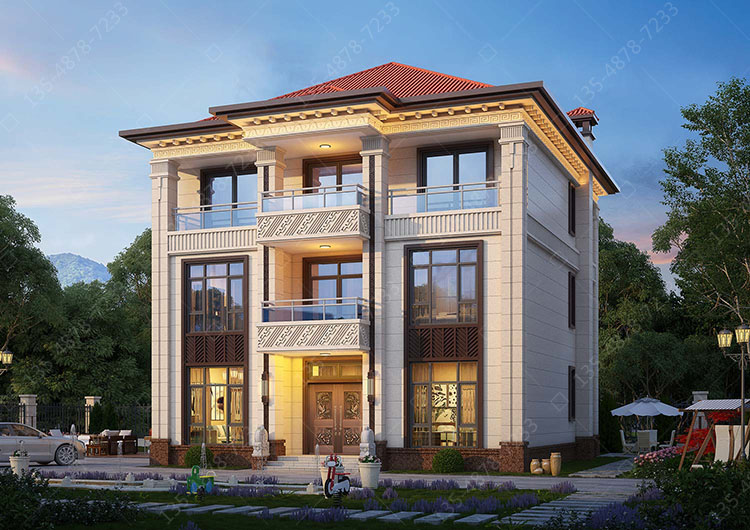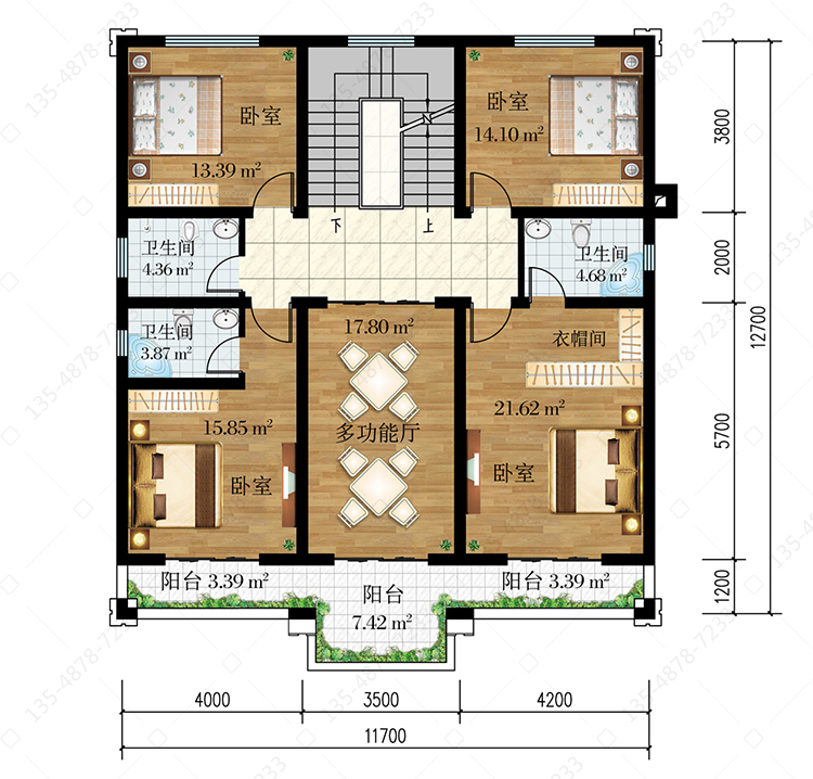 三 层:卧室(附卫生间、阳台)、卧室(附卫生间、衣帽间、阳台)、多功能厅(附阳台)、 2卧室、卫生间