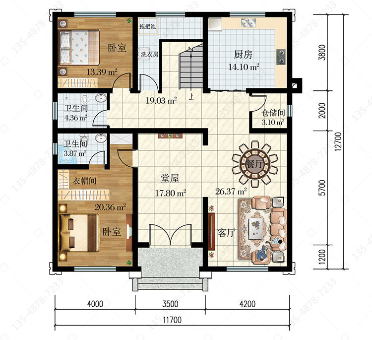 一 层:堂屋、客厅、卧室(附卫生间、衣帽间)、卧室、仓储间、厨房、餐厅、洗衣房、卫生间