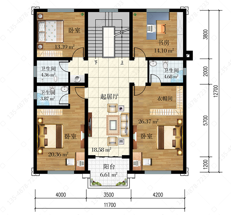 二 层:起居厅、卧室(附卫生间)、卧室(附卫生间、衣帽间)、卧室、书房、卫生间、阳台