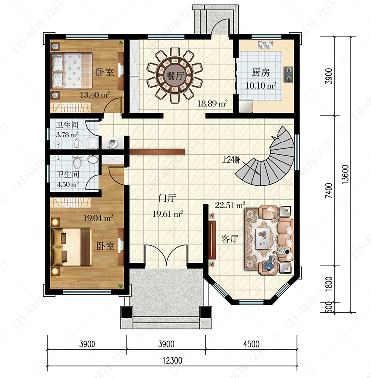 一 层:门厅、客厅(中空)、卧室(附卫生间)、卧室、厨房、餐厅、卫生间