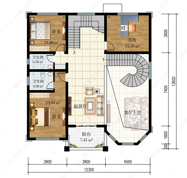 二 层:起居厅、卧室(附卫生间)、卧室、书房、卫生间、阳台