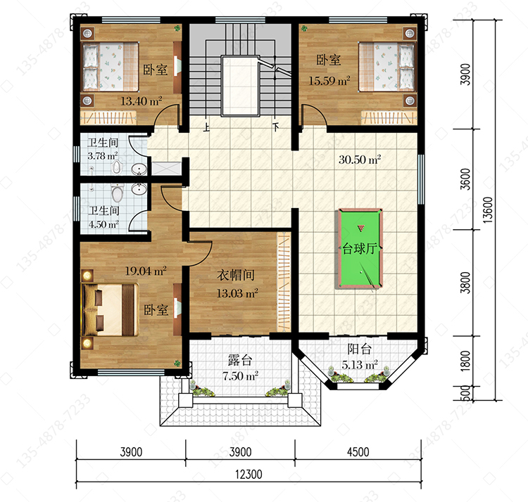 三 层:台球厅、卧室(附卫生间、衣帽间、露台)、2卧室、卫生间、阳台