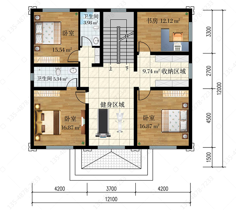 三 层:健身区域、卧室(附卫生间)、2卧室、书房、卫生间