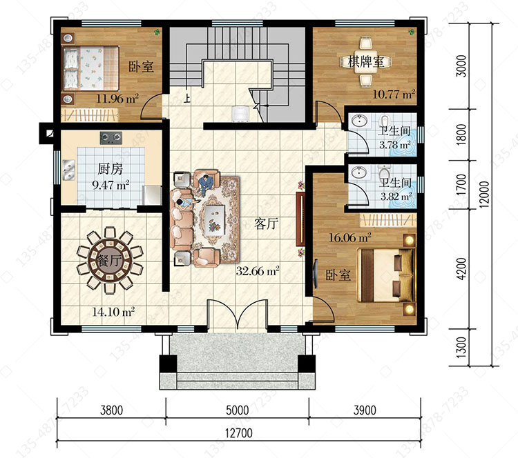 一 层:客厅、卧室(附卫生间)、卧室、棋牌室、厨房、餐厅、卫生间