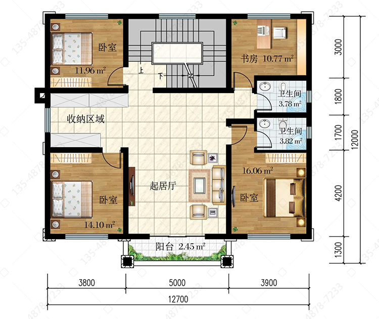 二 层:起居厅、收纳区域、卧室(附卫生间)、2卧室、书房、卫生间、阳台