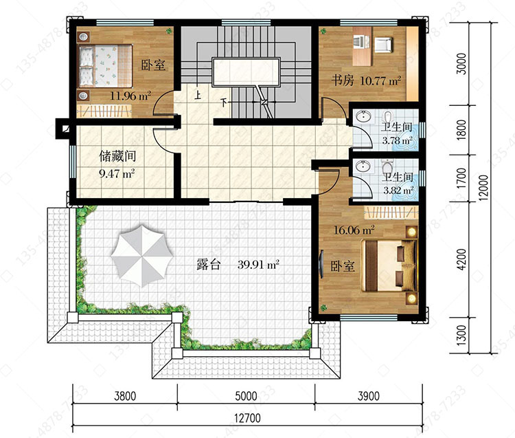 三 层:卧室(附卫生间)、卧室、书房、收藏间、卫生间、露台