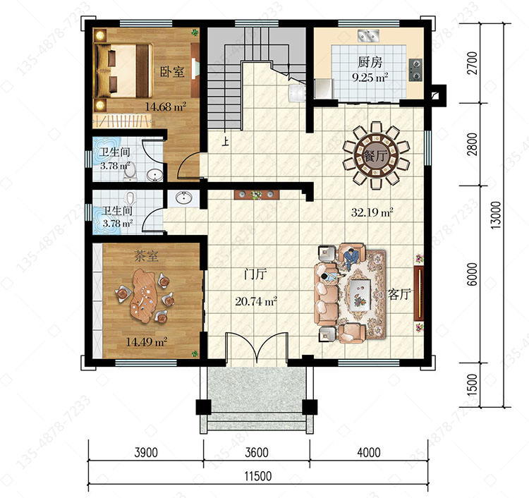 一 层:门厅、客厅(中空)、茶室、卧室(附卫生间)、卧室、厨房、餐厅、卫生间