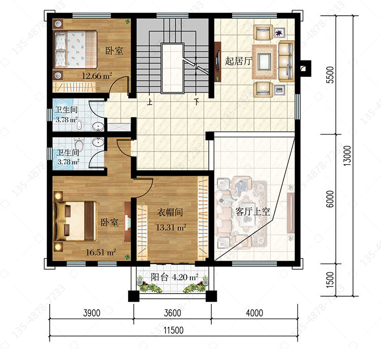 二 层:起居厅、卧室(附卫生间、衣帽间、阳台)、卧室、卫生间