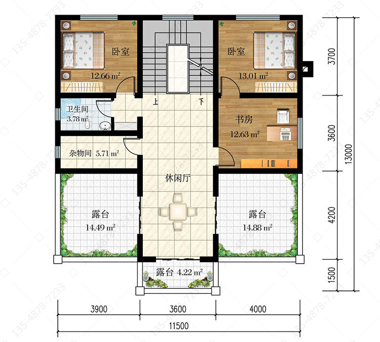 三 层:休闲厅、卧室(附书房)、卧室、卫生间、3露台