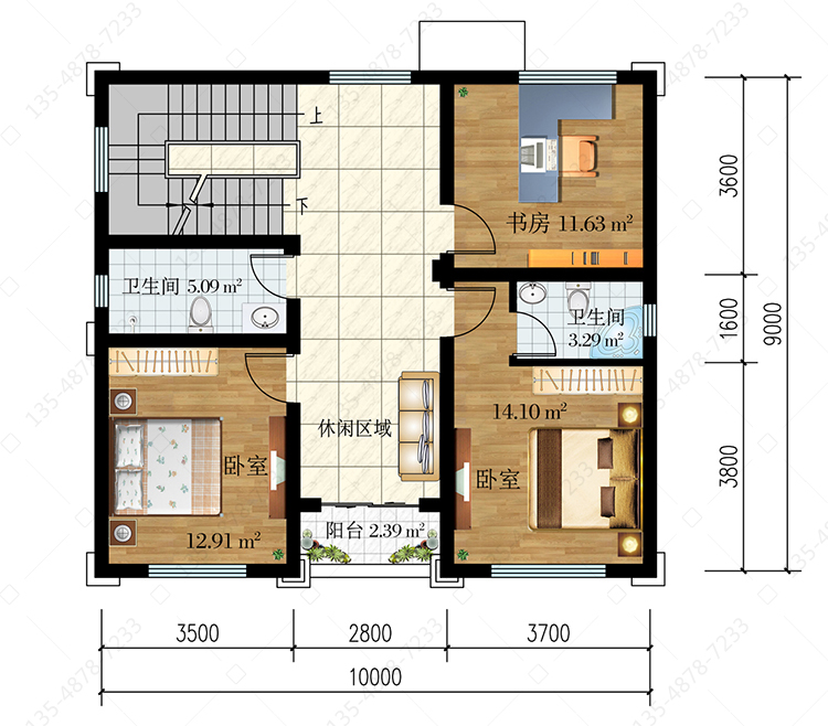二 层:休闲区域、卧室(附卫生间)、卧室、书房、卫生间、阳台