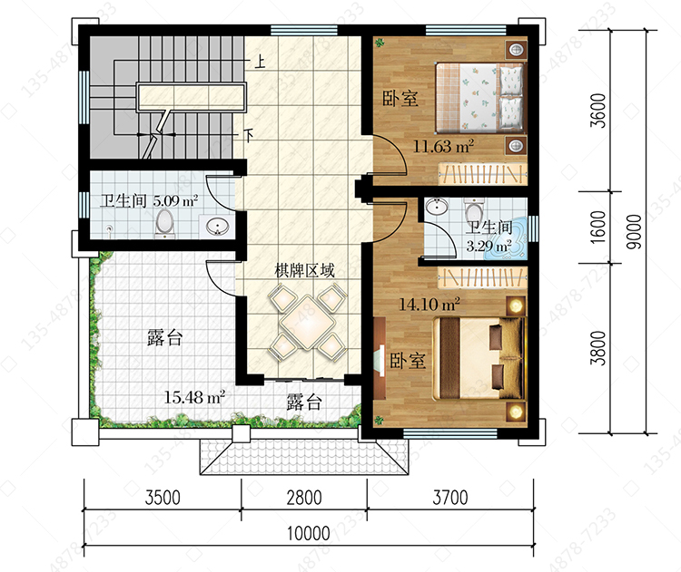 三 层:棋牌区域、卧室(附卫生间)、卧室、卫生间、露台