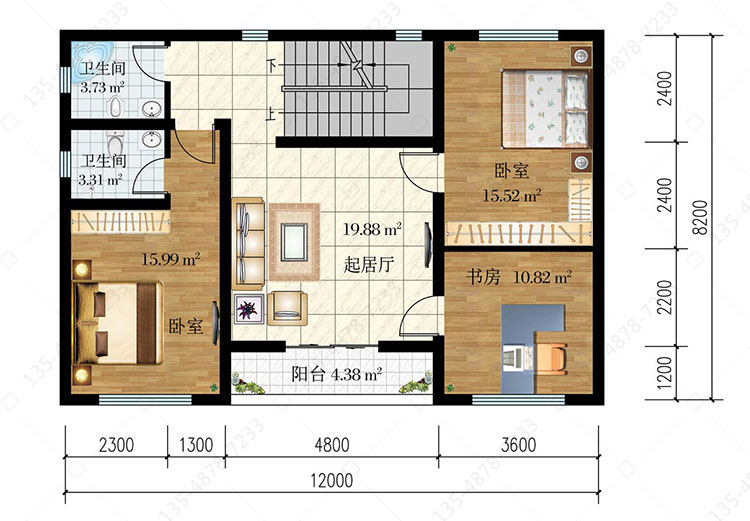 二 层:起居厅、卧室(附卫生间)、卧室、书房、卫生间、阳台