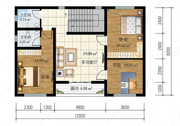 三 层:多功能厅、卧室(附卫生间)、卧室、书房、卫生间、露台