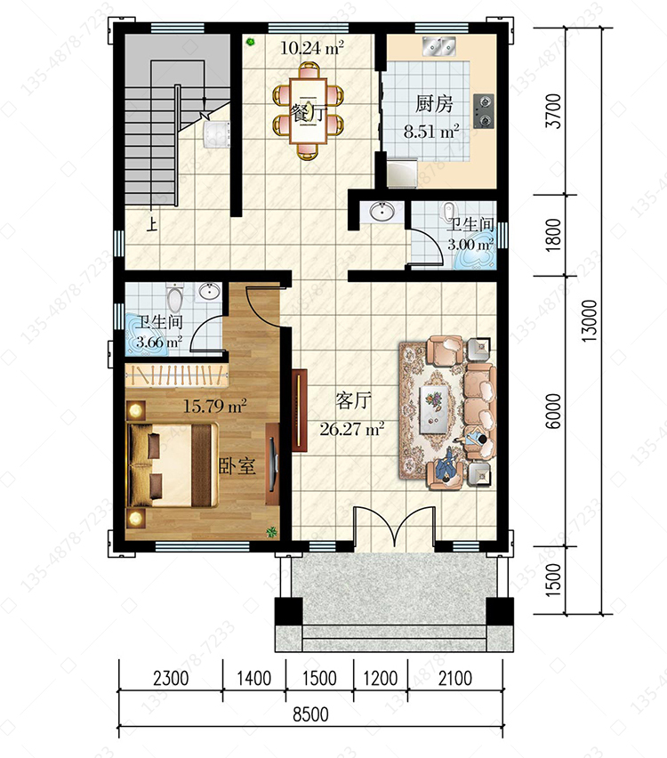 一 层:客厅、卧室(附卫生间)、厨房、餐厅、卫生间