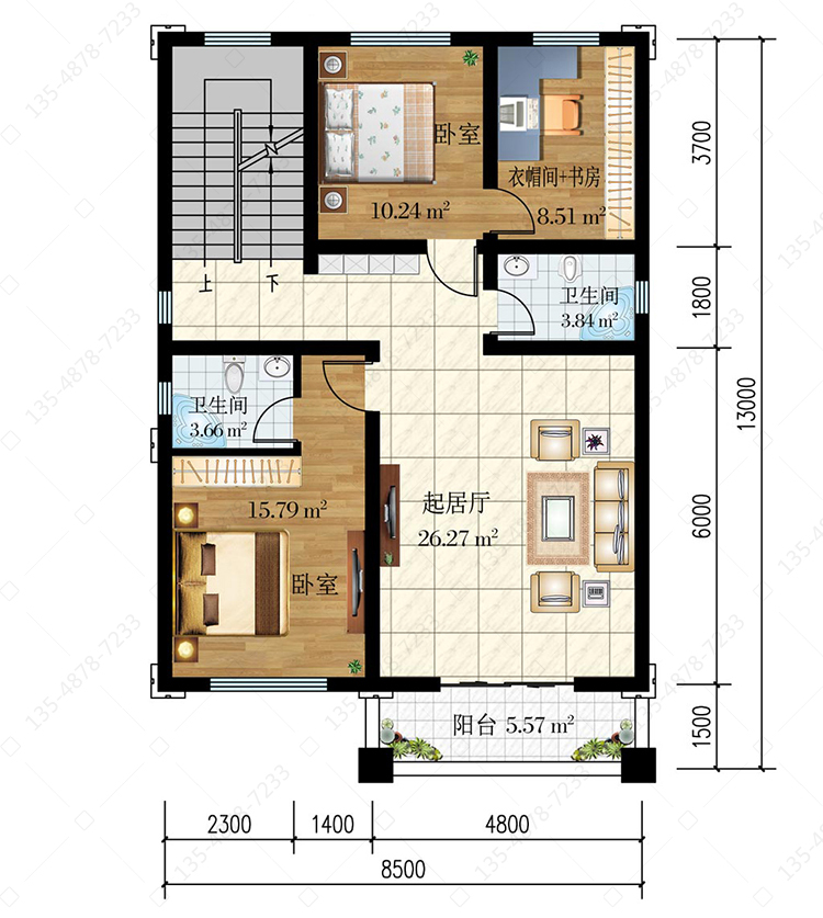 二 层:起居厅、卧室(附卫生间)、卧室(附衣帽间+书房)、卫生间、阳台