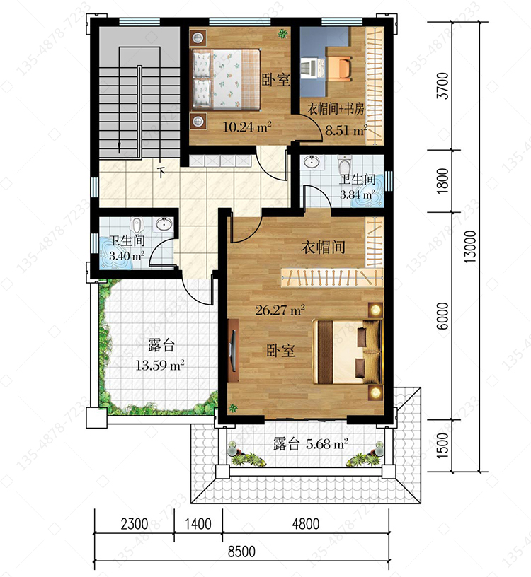 三 层:卧室(附衣帽间、卫生间、露台)、卧室(附衣帽间+书房)、卫生间、露台