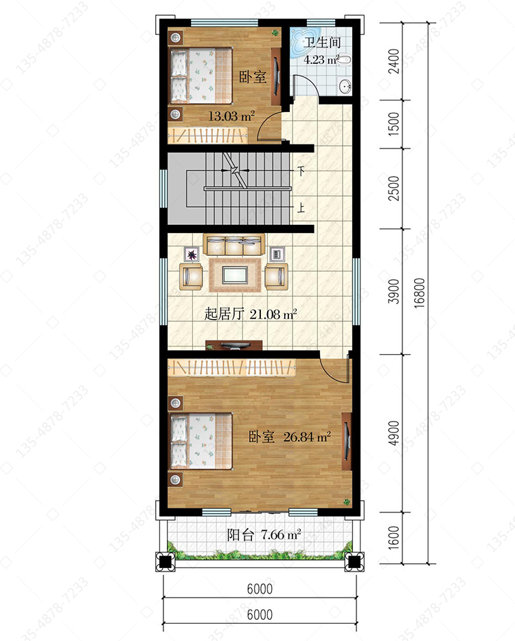 二 层:起居厅、卧室(附阳台)、卧室、卫生间