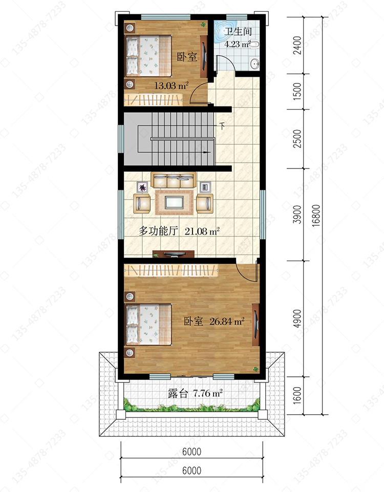 三 层:多功能厅、卧室(附露台)、卧室、卫生间
