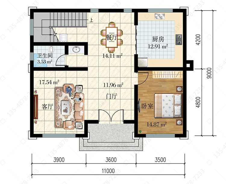 一 层:门厅、客厅、卧室、厨房、餐厅、卫生间