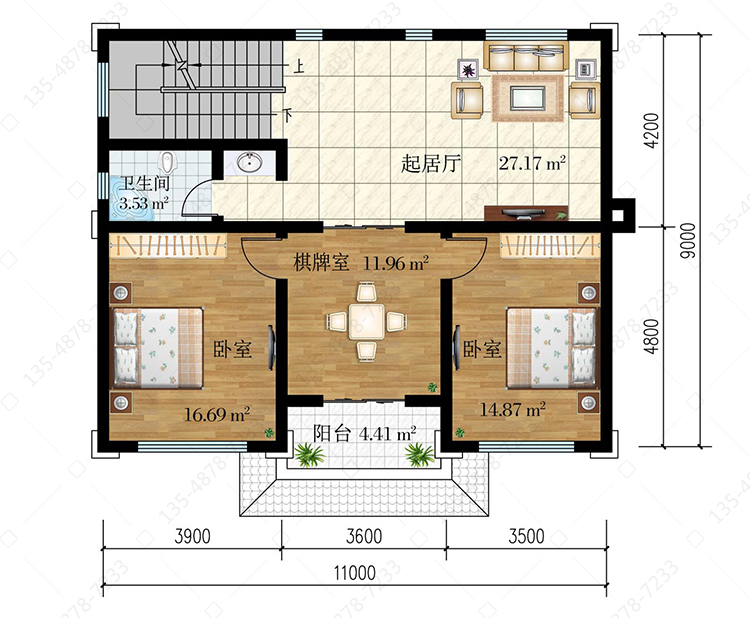二 层:起居厅、棋牌室、2卧室、卫生间、阳台