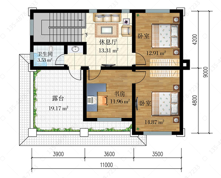 三 层:休息厅、卧室(附书房)、卧室、卫生间、露台