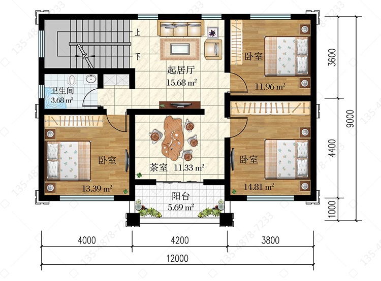 二 层:起居厅、茶室(附阳台)、3卧室、卫生间