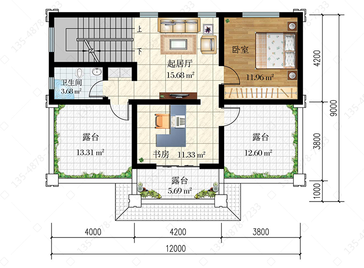 三 层:起居厅、卧室、书房(附露台)、卫生间、2露台