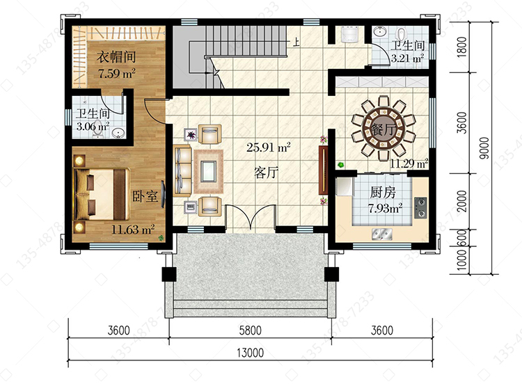 一 层:客厅、卧室(附卫生间、衣帽间)、厨房、餐厅、卫生间