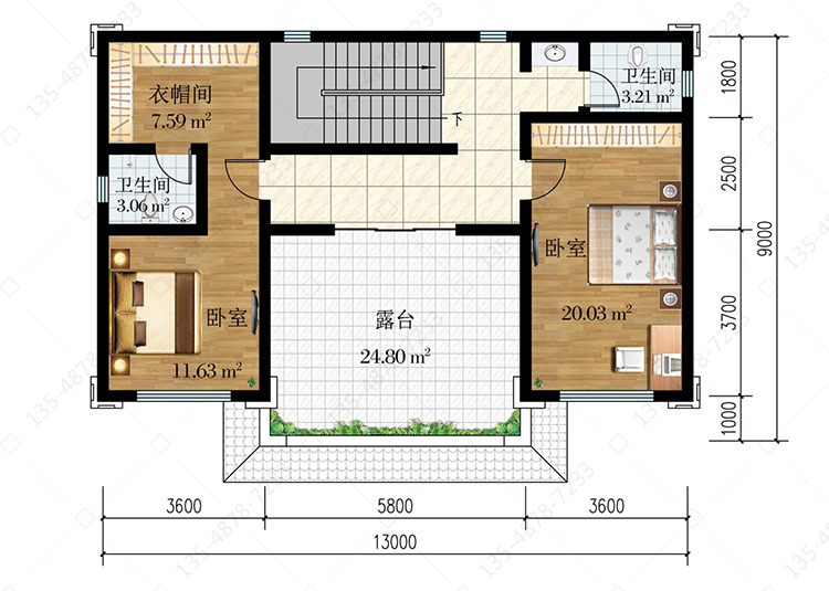 三 层:卧室(附卫生间、衣帽间)、卧室、卫生间、露台