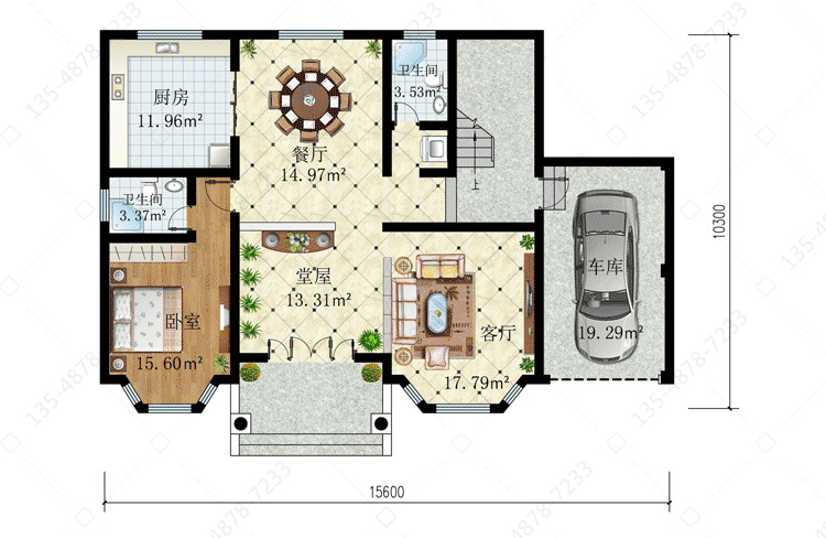 一 层:堂屋、客厅、卧室(附卫生间)、厨房、餐厅、卫生间、车库