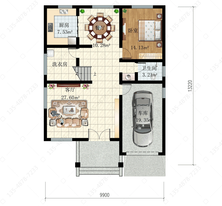 一 层:客厅、卧室、厨房、餐厅、洗衣房、卫生间、车库