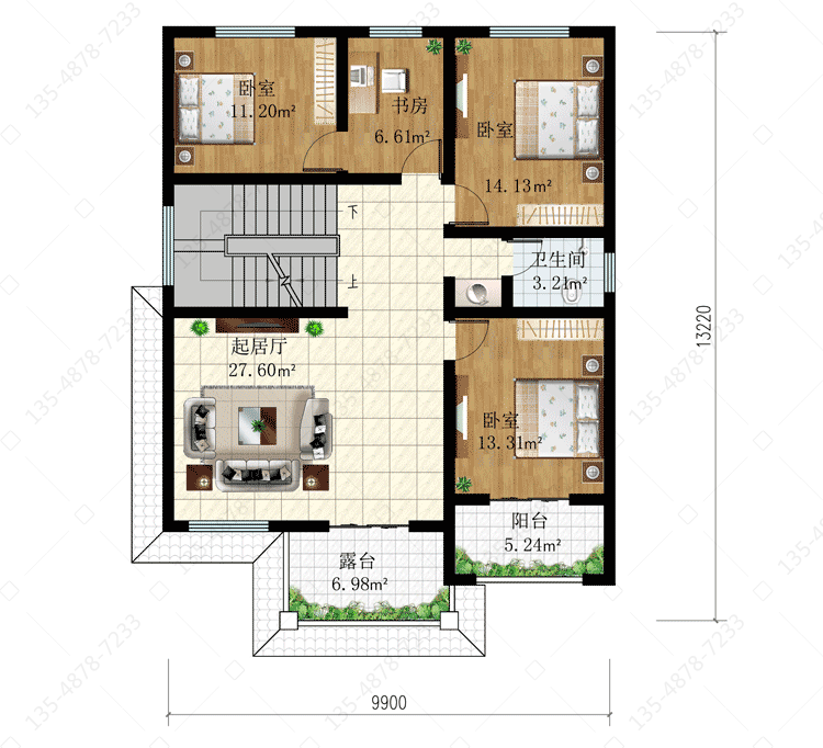 三 层: 起居厅、卧室(附书房)、卧室、卫生间、2露台