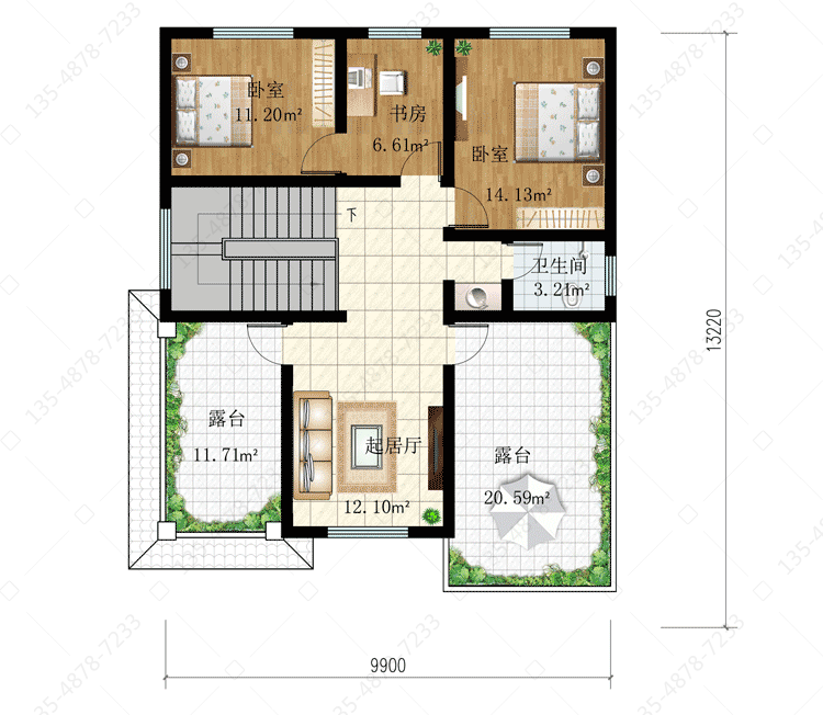 二 层:起居厅、卧室(附阳台)、卧室(附书房)、卧室、卫生间、露台