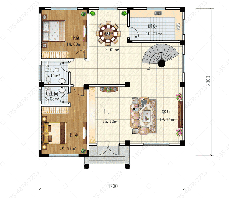 一 层:客厅、卧室(附卫生间)、卧室、厨房、餐厅、卫生间