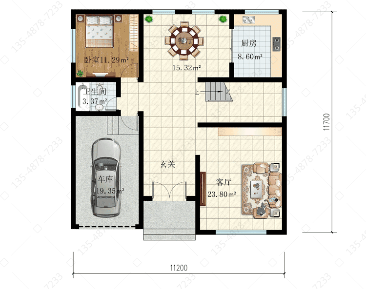 一 层:客厅(中空)、卧室、厨房、餐厅、卫生间、车库