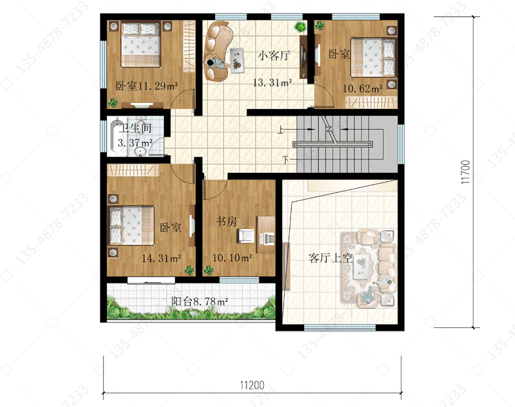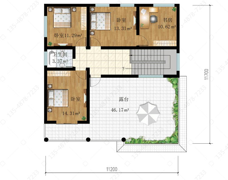 三 层:卧室(附书房)、2卧室、卫生间、露台