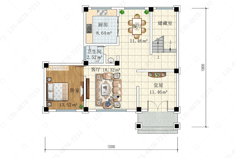 一 层:堂屋、客厅、卧室、厨房、餐厅、储藏室、卫生间