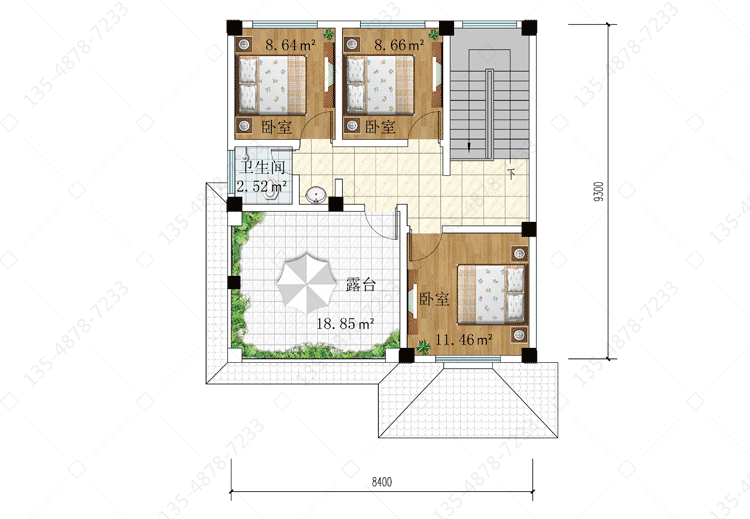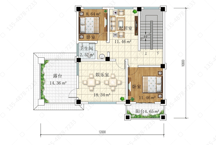 二 层:起居室、娱乐室、卧室(附阳台)、卧室、卫生间、露台